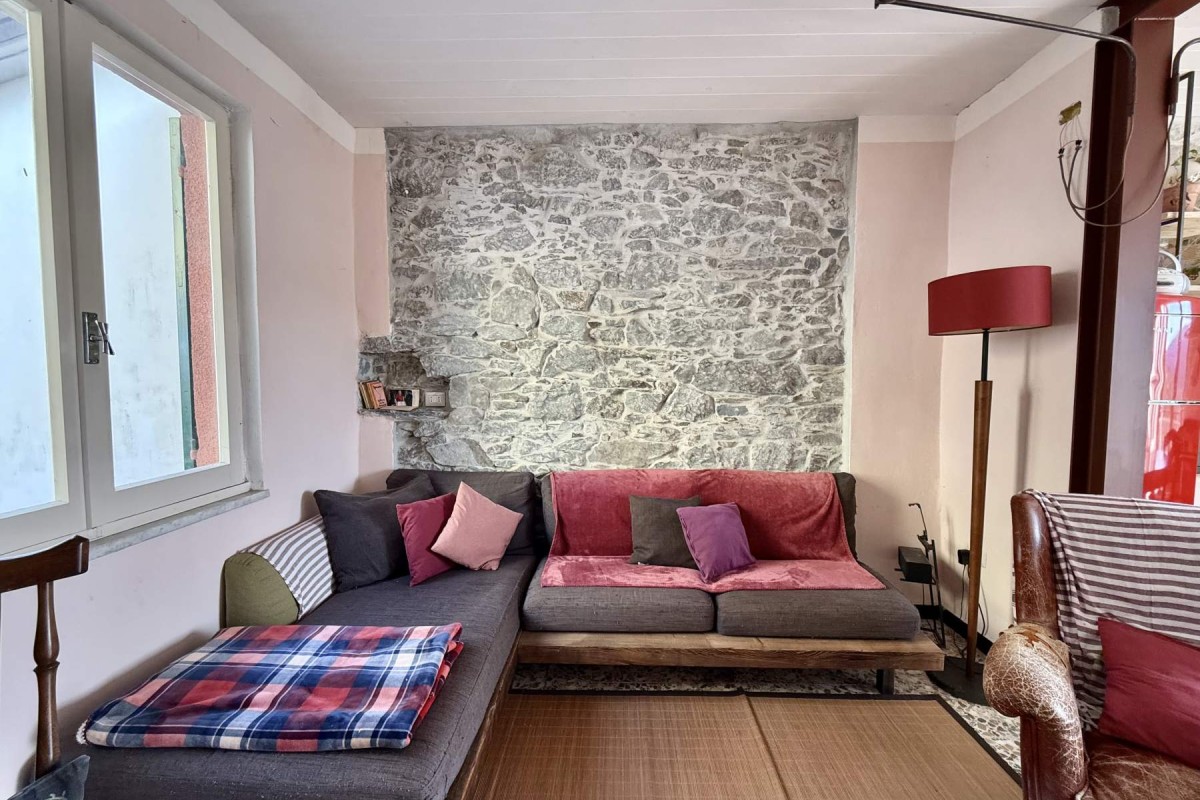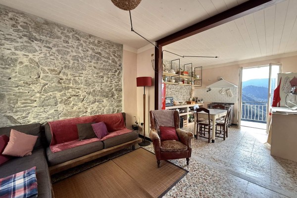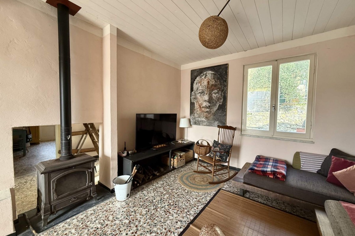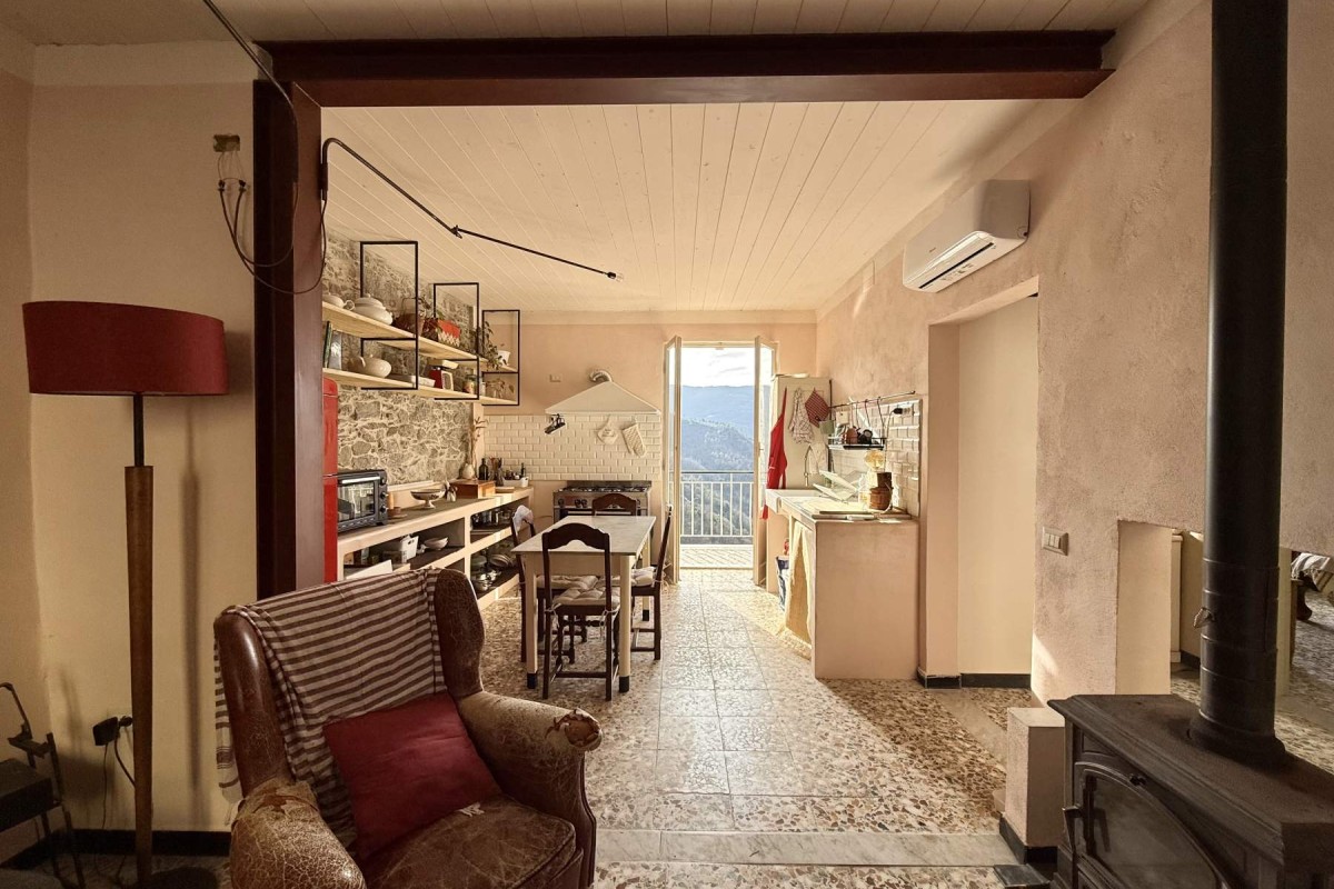 L’interno è così composto: luminoso soggiorno con camino e cucina a vista, con accesso a un primo balcone;